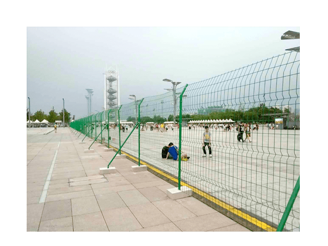采用冷拔低碳熱鍍鋅鋼絲焊接而成,整張無拼接。三個加強彎使網片更加結實,牢固,繃直,不易彎曲。立柱采用全鋼圓形型材,材質為Q235,立柱高度不小于2550mm;每根立柱加一個斜撐,水泥墩尺寸:500×300×150 mm。